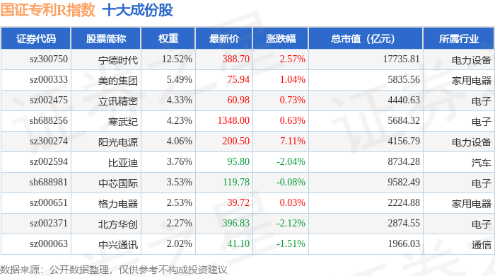 证券之星消息,11月5日,国证专利R(480070)指数报收于4557.34点,涨0.61%,成交1787.94亿元,换手率1.2%。当日该指数成份股中,上涨的有40家,阳光电源以7.11%的涨幅领涨,下跌的有59家,荣昌生物以4.9%的跌幅领跌。