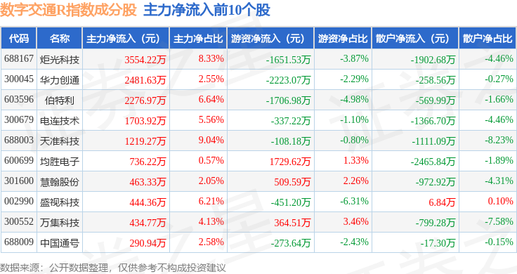 资金流向方面,数字交通R(480075)指数成份股当日主力资金净流出合计12.48亿元,游资资金净流入合计3.56亿元,散户资金净流入合计8.92亿元。成份股资金流向详情见下表: