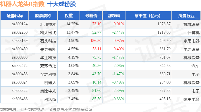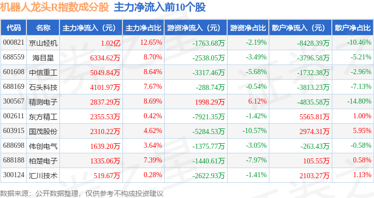 资金流向方面,机器人龙头R(480071)指数成份股当日主力资金净流出合计12.68亿元,游资资金净流入合计1.21亿元,散户资金净流入合计11.47亿元。成份股资金流向详情见下表: