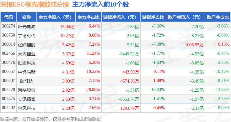 资金流向方面,深指ESG领先(970029)指数成份股当日主力资金净流入合计9.21亿元,游资资金净流出合计9.54亿元,散户资金净流入合计3256.85万元。成份股资金流向详情见下表: