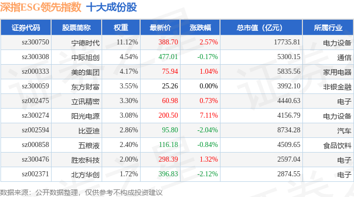证券之星消息,11月5日,深指ESG领先(970029)指数报收于14206.37点,涨0.65%,成交2599.99亿元,换手率1.52%。当日该指数成份股中,上涨的有99家,东方日升以11.15%的涨幅领涨,下跌的有96家,完美世界以6.01%的跌幅领跌。
