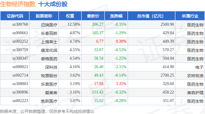 生物经济(970038)指数十大成份股详情如下: