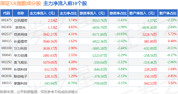 资金流向方面,深证XR(970046)指数成份股当日主力资金净流出合计18.24亿元,游资资金净流入合计1.83亿元,散户资金净流入合计16.41亿元。成份股资金流向详情见下表: