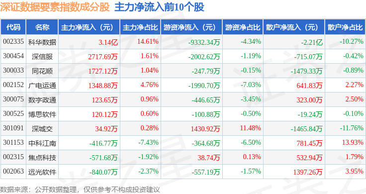 资金流向方面,深证数据要素(970053)指数成份股当日主力资金净流出合计26.45亿元,游资资金净流入合计4.24亿元,散户资金净流入合计22.21亿元。成份股资金流向详情见下表: