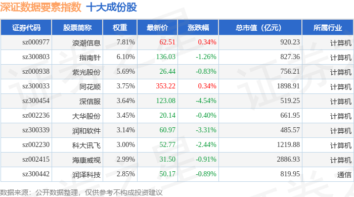 证券之星消息,11月5日,深证数据要素(970053)指数报收于3957.1点,跌1.05%,成交421.37亿元,换手率2.48%。当日该指数成份股中,上涨的有6家,科华数据以3.85%的涨幅领涨,下跌的有44家,深信服以4.54%的跌幅领跌。