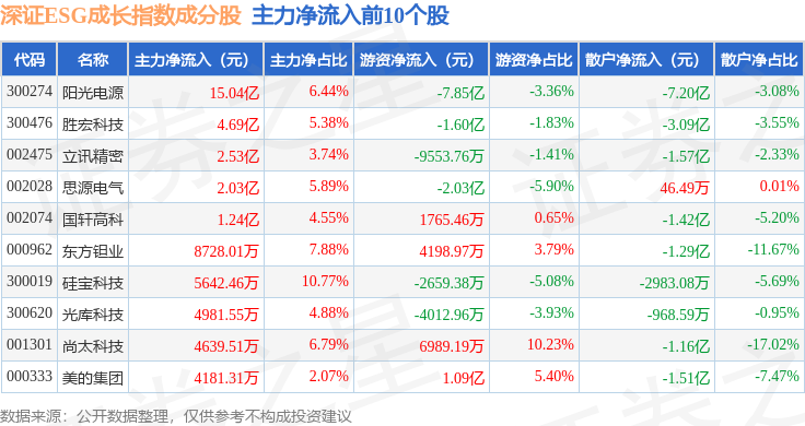 资金流向方面,深证ESG成长(970060)指数成份股当日主力资金净流入合计4.12亿元,游资资金净流出合计5.03亿元,散户资金净流入合计9076.25万元。成份股资金流向详情见下表: