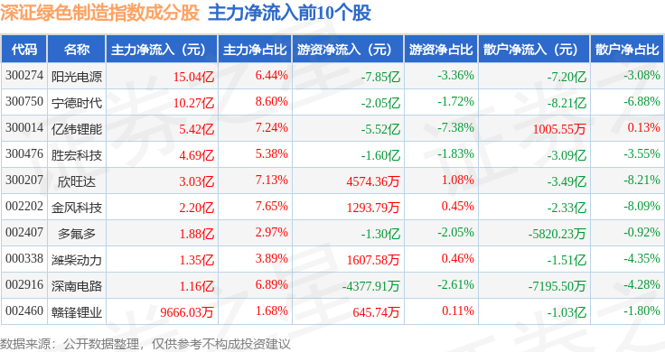 资金流向方面,深证绿色制造(970069)指数成份股当日主力资金净流入合计34.0亿元,游资资金净流出合计14.57亿元,散户资金净流出合计19.43亿元。成份股资金流向详情见下表: