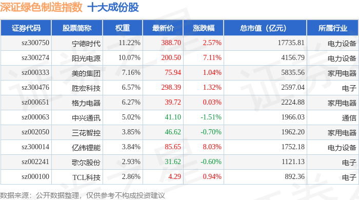 深证绿色制造(970069)指数十大成份股详情如下: