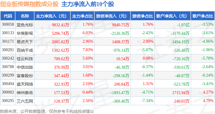 资金流向方面,创业板传媒(970084)指数成份股当日主力资金净流出合计7.46亿元,游资资金净流入合计2.7亿元,散户资金净流入合计4.76亿元。成份股资金流向详情见下表:
