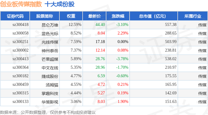 创业板传媒(970084)指数十大成份股详情如下: