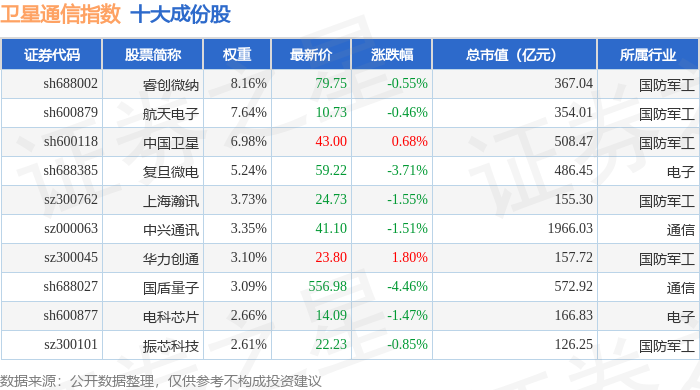 证券之星消息,11月5日,卫星通信(980018)指数报收于3685.35点,跌0.49%,成交306.96亿元,换手率0.84%。当日该指数成份股中,上涨的有20家,华曙高科以6.32%的涨幅领涨,下跌的有30家,国盾量子以4.46%的跌幅领跌。