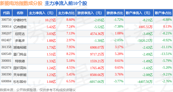 资金流向方面,新能电池(980032)指数成份股当日主力资金净流入合计16.64亿元,游资资金净流出合计2.07亿元,散户资金净流出合计14.58亿元。成份股资金流向详情见下表:
