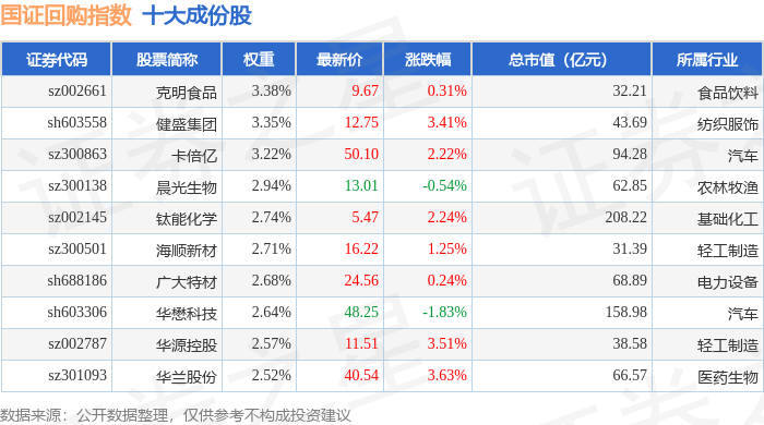 证券之星消息,11月5日,国证回购(980063)指数报收于3377.95点,涨0.77%,成交121.79亿元,换手率1.34%。当日该指数成份股中,上涨的有37家,华兰股份以3.63%的涨幅领涨,下跌的有11家,帝奥微以3.62%的跌幅领跌。