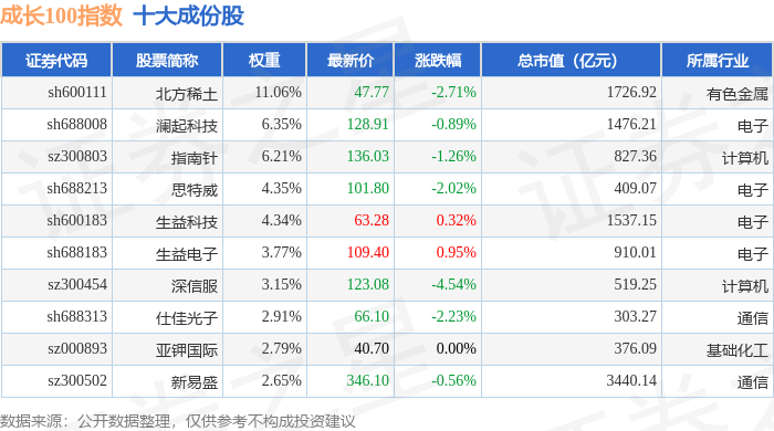 证券之星消息,11月5日,成长100(980080)指数报收于9341.78点,跌0.87%,成交651.74亿元,换手率2.31%。当日该指数成份股中,上涨的有36家,同飞股份以13.4%的涨幅领涨,下跌的有59家,富士达以7.68%的跌幅领跌。