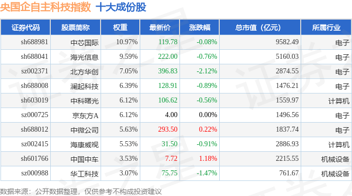 央国企自主科技(980083)指数十大成份股详情如下: