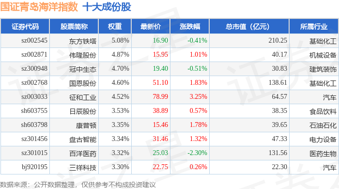 国证青岛海洋(980532)指数十大成份股详情如下: