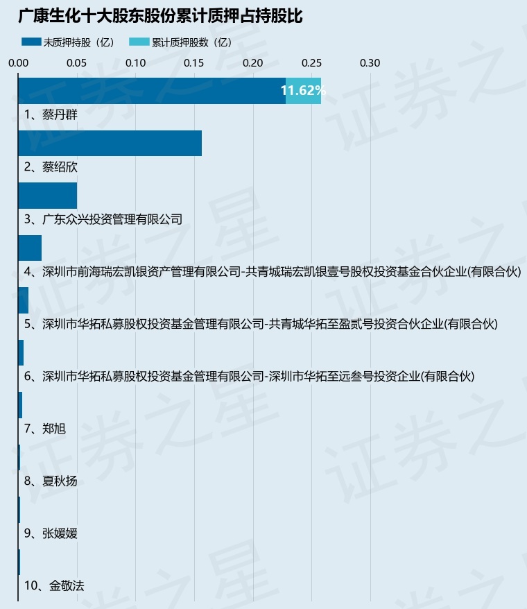截止本公告日,股东蔡丹群已累计质押股份300.0万股,占其持股总数的11.62%。本次质押后广康生化十大股东的累计质押股份占持股比例(占持股比例的计算以公司最新一期财务报表公布的十大股东的持股总数为基准)见下图: