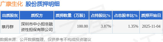 证券之星消息,广康生化(300804)11月5日公开信息显示,股东蔡丹群向深圳市中小担非融资性担保有限公司合计质押100.0万股,占总股本1.35%。质押详情见下表: