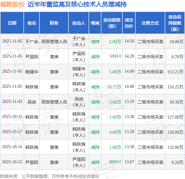 福鞍股份近半年内的董监高及核心技术人员增减持详情如下: