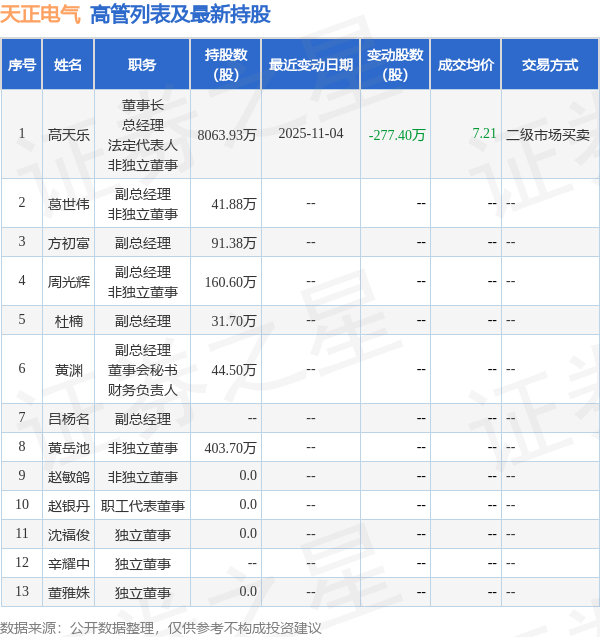 天正电气的高管列表及最新持股情况如下:
