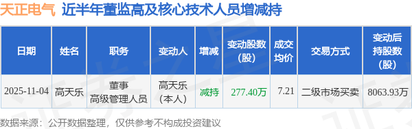 证券之星消息,根据11月5日市场公开信息、上市公司公告及交易所披露数据整理,天正电气(605066)最新董监高及相关人员股份变动情况:2025年11月4日公司董事,高级管理人员高天乐共减持公司股份277.4万股,占公司总股本为0.5496%。变动期间公司股价上涨0.92%,11月4日当日收盘报7.66元。