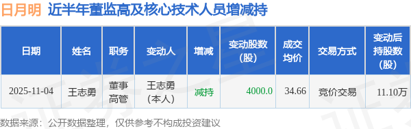 证券之星消息,根据11月5日市场公开信息、上市公司公告及交易所披露数据整理,日月明(300906)最新董监高及相关人员股份变动情况:2025年11月4日公司董事,高管王志勇共减持公司股份4000.0股,占公司总股本为0.005%。变动期间公司股价下跌3.96%,11月4日当日收盘报34.18元。
