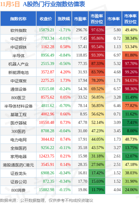 热门行业指数方面,软件指数的市盈率百分位较高,为97.63%。而800消费的市盈率百分位较低,为11.79%。