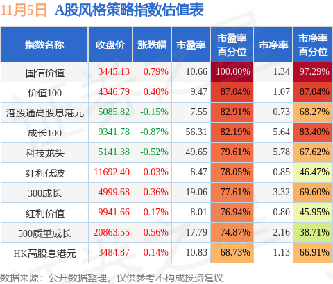 风格策略指数方面,国信价值的市盈率百分位较高,为100.0%。而HK高股息港元的市盈率百分位较低,为68.73%。