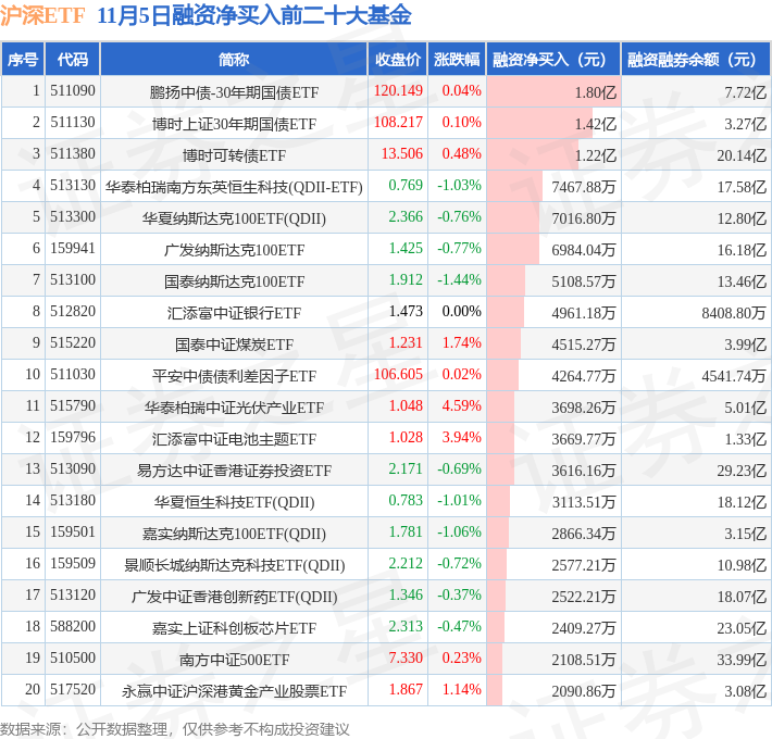 沪深ETF融资净买入前三分别为:鹏扬中债-30年期国债ETF(511090)融资净买入1.8亿元、博时上证30年期国债ETF(511130)融资净买入1.42亿元、博时可转债ETF(511380)融资净买入1.22亿元,前20具体见下表: