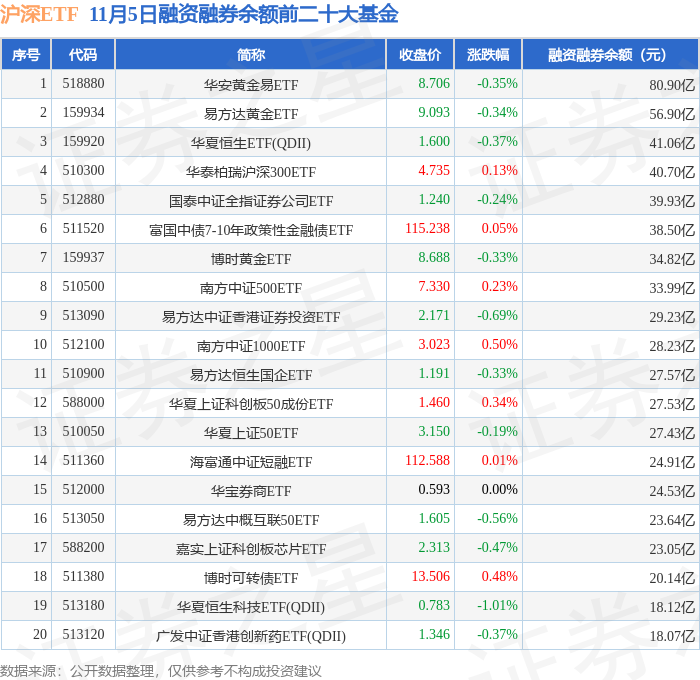 沪深ETF融资融券余额前三分别为:华安黄金易ETF(518880)融资融券余额80.9亿元、易方达黄金ETF(159934)融资融券余额56.9亿元、华夏恒生ETF(QDII)(159920)融资融券余额41.06亿元,前20具体见下表: