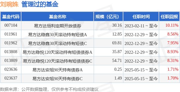刘琬姝女士:金融硕士。曾任易方达基金管理有限公司投资经理助理。现任易方达基金管理有限公司基金经理助理、固定收益研究员。2020年12月22日起任职易方达年年恒春纯债一年定期开放债券型发起式证券投资基金、易方达年年恒夏纯债一年定期开放债券型发起式证券投资基金、易方达年年恒秋纯债一年定期开放债券型发起式证券投资基金、易方达永旭添利定期开放债券型证券投资基金、易方达纯债1年定期开放债券型证券投资基金、易方达安源中短债债券型证券投资基金、易方达恒兴3个月定期开放债券型发起式证券投资基金的基金经理助理。2020年12月22日起任职为易方达年年恒实纯债一年定期开放债券型发起式证券投资基金的基金经理助理。曾任易方达稳丰90天滚动持有短债债券型证券投资基金的基金经理助理。2021年12月14日起担任易方达稳悦120天滚动持有短债债券型证券投资基金的基金经理助理。2022年12月29日起担任易方达稳鑫30天滚动持有短债债券型证券投资基金、易方达稳悦120天滚动持有短债债券型证券投资基金基金经理。2023年2月11日任易方达恒利3个月定期开放债券型发起式证券投资基金的基金经理。2023年3月25日担任易方达富惠纯债债券型证券投资基金的基金经理助理。2023年4月4日担任易方达恒固18个月封闭式债券型证券投资基金的基金经理助理。2023年8月17日起担任易方达恒惠定期开放债券型发起式证券投资基金的基金经理助理。2024年3月29日担任易方达兴利180天持有期债券型证券投资基金的基金经理助理。易方达安旭90天持有期债券型证券投资基金的基金经理。