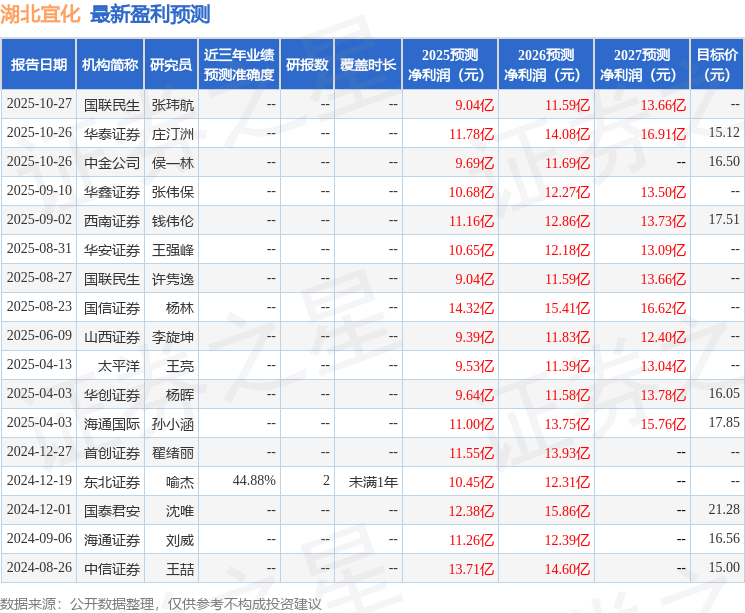 最新盈利预测明细如下: