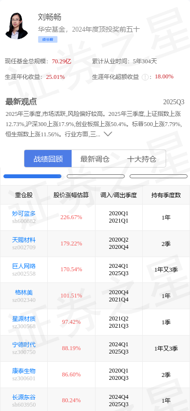 华虹半导体(01347)是基金经理刘畅畅的重仓股。,其在整个职业生涯内年化收益高达25.01%。刘畅畅的大佬持仓 - 战绩回顾截图如下: