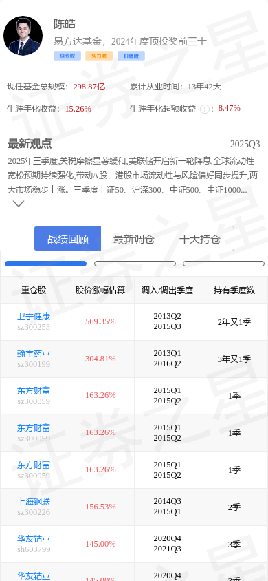 上海复旦(01385)是基金大佬陈皓的重仓股。,其在整个职业生涯内年化收益高达15.26%。陈皓的大佬持仓 - 战绩回顾截图如下: