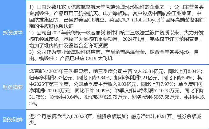 证券之星消息,派克新材11月6日涨停收盘,收盘价75.43元。该股于9点35分涨停,4次打开涨停,截止收盘封单资金为2320.98万元,占其流通市值0.25%。