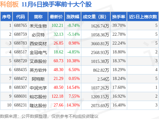 当日科创板换手率前10大个股中7只个股收涨,平均涨幅7.76%,其中禾元生物(688765)以换手率39.7%排第一,9只个股近5个交易日中多次上榜。