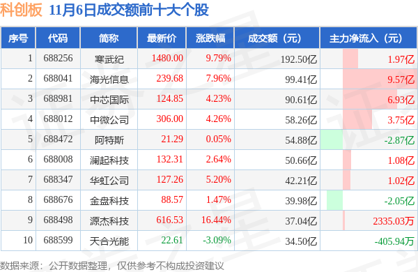当日科创板成交额前10大个股中9只个股收涨,平均涨幅5.78%,其中寒武纪(688256)以成交额192.5亿元排第一。从主力资金流入看,成交额前10大个股中有7只个股呈现主力资金净流入。