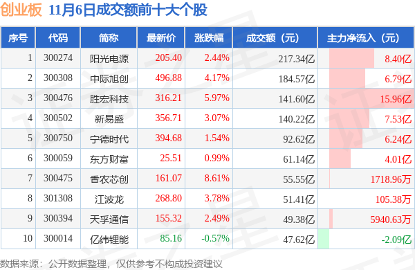 当日创业板成交额前10大个股中9只个股收涨,平均涨幅3.67%,其中阳光电源(300274)以成交额217.34亿元排第一。从主力资金流入看,成交额前10大个股中有9只个股呈现主力资金净流入。
