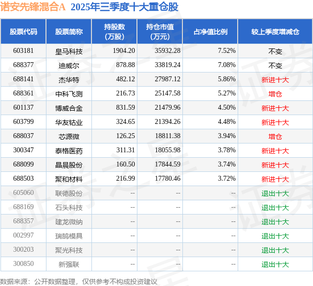 根据2025基金Q3季报公募基金重仓股数据,重仓该股的公募基金共8家,其中持有数量最多的公募基金为诺安基金的诺安先锋混合A。诺安先锋混合A目前规模为43.45亿元,最新净值3.3377(11月5日),较上一交易日上涨0.94%,近一年上涨36.7%。该公募基金现任基金经理为杨谷。杨谷在任的基金产品包括:诺安优选回报混合A,管理时间为2023年10月21日至今,期间收益率为42.36%;诺安精选回报混合,管理时间为2023年10月21日至今,期间收益率为48.98%;诺安进取回报混合,管理时间为2024年4月13日至今,期间收益率为59.74%。