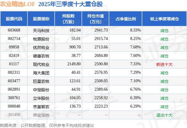 根据2025基金Q3季报公募基金重仓股数据,重仓该股的公募基金共2家,其中持有数量最多的公募基金为前海开源基金的农业精选LOF。农业精选LOF目前规模为2.39亿元,最新净值1.1393(11月5日),较上一交易日上涨0.02%,近一年上涨4.6%。该公募基金现任基金经理为吴国清 刘宏。吴国清在任的基金产品包括:前海开源沪港深核心资源混合A,管理时间为2016年10月17日至今,期间收益率为367.59%;前海开源一带一路混合A,管理时间为2019年7月19日至今,期间收益率为-25.34%;前海开源金银珠宝混合A,管理时间为2021年6月1日至今,期间收益率为74.94%。刘宏在任的基金产品包括:前海开源周期优选混合A,管理时间为2021年3月12日至今,期间收益率为61.82%;前海开源股息率100强股票A,管理时间为2021年4月22日至今,期间收益率为33.89%;前海开源大海洋混合,管理时间为2022年8月8日至今,期间收益率为-33.83%。