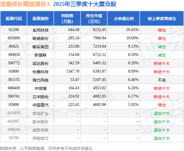 宝盈成长精选混合A的前十大重仓股如下: