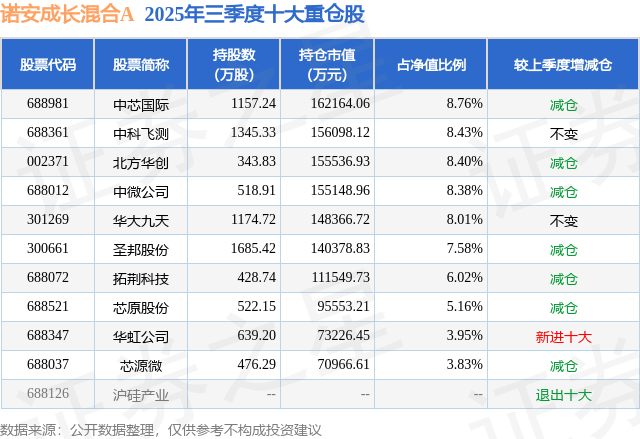 根据2025基金Q3季报公募基金重仓股数据,重仓该股的公募基金共161家,其中持有数量最多的公募基金为诺安基金的诺安成长混合A。诺安成长混合A目前规模为184.68亿元,最新净值1.879(11月5日),较上一交易日下跌0.58%,近一年上涨35.18%。该公募基金现任基金经理为刘慧影。刘慧影在任的基金产品包括:诺安优化配置混合A,管理时间为2022年8月3日至今,期间收益率为63.47%;诺安积极回报混合A,管理时间为2023年9月29日至今,期间收益率为25.07%。