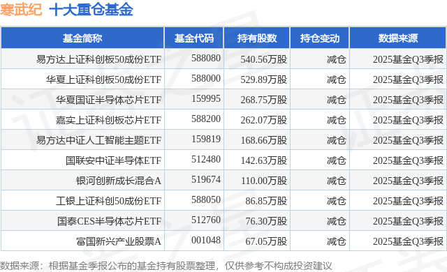 根据2025基金Q3季报公募基金重仓股数据,重仓该股的公募基金共898家,其中持有数量最多的公募基金为易方达基金的易方达上证科创板50成份ETF。易方达上证科创板50成份ETF目前规模为767.61亿元,最新净值1.4144(11月5日),较上一交易日上涨0.23%,近一年上涨40.09%。该公募基金现任基金经理为林伟斌 成曦。林伟斌在任的基金产品包括:易方达中证红利ETF,管理时间为2019年11月26日至今,期间收益率为83.14%;易方达中证红利ETF联接发起式A,管理时间为2020年7月8日至今,期间收益率为56.72%;易方达上证科创50联接A,管理时间为2021年3月1日至今,期间收益率为6.71%。成曦在任的基金产品包括:易方达创业板ETF联接A,管理时间为2016年5月7日至今,期间收益率为49.86%;易方达深证100ETF,管理时间为2016年5月7日至今,期间收益率为82.9%;易方达创业板ETF,管理时间为2016年5月7日至今,期间收益率为53.33%;