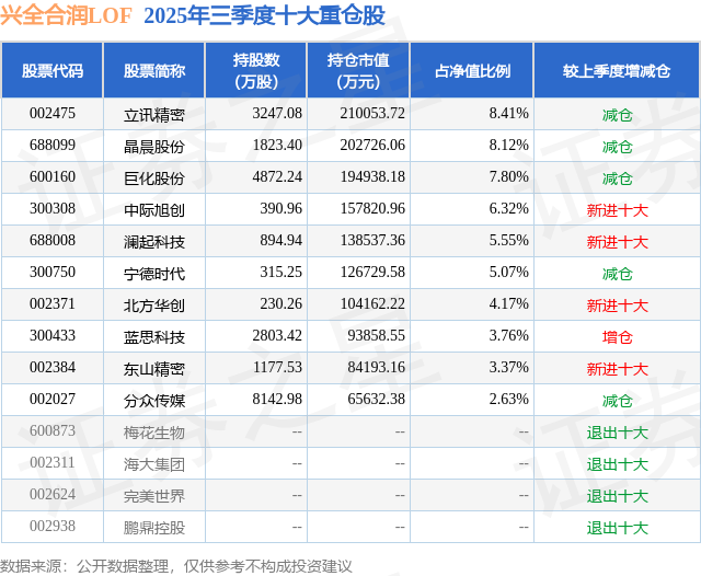 根据2025基金Q3季报公募基金重仓股数据,重仓该股的公募基金共132家,其中持有数量最多的公募基金为兴证全球基金的兴全合润LOF。兴全合润LOF目前规模为249.14亿元,最新净值2.0156(11月5日),较上一交易日下跌0.1%,近一年上涨27.86%。该公募基金现任基金经理为谢治宇。谢治宇在任的基金产品包括:兴全合宜混合(LOF)A,管理时间为2018年1月23日至今,期间收益率为94.81%;兴全社会价值三年持有混合,管理时间为2019年12月26日至今,期间收益率为106.66%;兴全合润混合C,管理时间为2025年4月8日至今,期间收益率为43.63%。