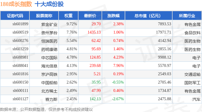 证券之星消息,11月6日,180成长(000028)指数报收于3909.26点,涨1.92%,成交1299.22亿元,换手率1.13%。当日该指数成份股中,上涨的有48家,中国铝业以10.03%的涨幅领涨,下跌的有10家,赛力斯以2.67%的跌幅领跌。
