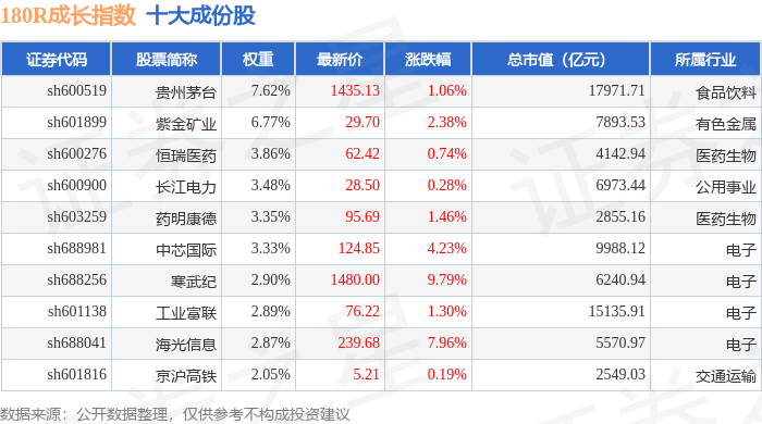 证券之星消息,11月6日,180R成长(000030)指数报收于2625.38点,涨2.07%,成交2538.98亿元,换手率1.01%。当日该指数成份股中,上涨的有104家,中国铝业以10.03%的涨幅领涨,下跌的有22家,天合光能以3.09%的跌幅领跌。
