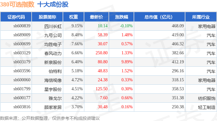 证券之星消息,11月6日,380可选(000107)指数报收于5735.07点,涨1.1%,成交121.99亿元,换手率1.22%。当日该指数成份股中,上涨的有25家,新泉股份以9.89%的涨幅领涨,下跌的有8家,长白山以9.48%的跌幅领跌。
