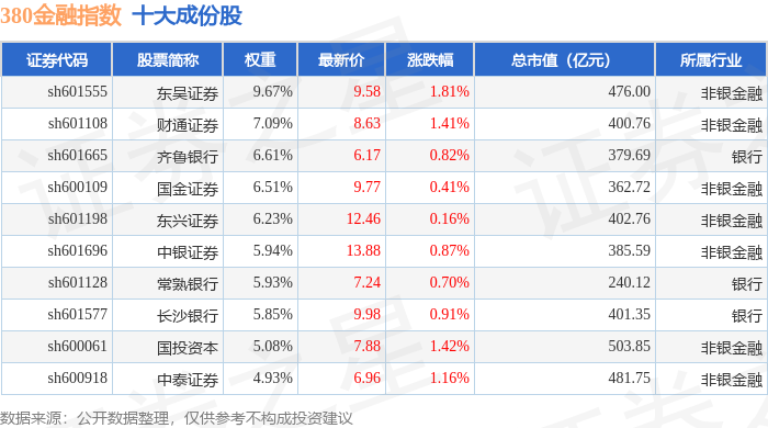 证券之星消息,11月6日,380金融(000110)指数报收于4369.93点,涨0.53%,成交80.78亿元,换手率1.22%。当日该指数成份股中,上涨的有15家,东吴证券以1.81%的涨幅领涨,下跌的有4家,厦门银行以2.58%的跌幅领跌。