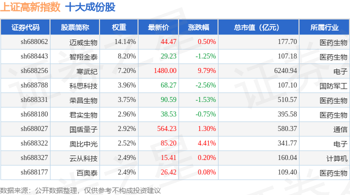 证券之星消息,11月6日,上证高新(000131)指数报收于3763.81点,涨1.31%,成交512.27亿元,换手率1.52%。当日该指数成份股中,上涨的有32家,寒武纪以9.79%的涨幅领涨,下跌的有17家,科思科技以2.56%的跌幅领跌。