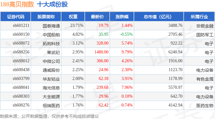 证券之星消息,11月6日,180高贝(000135)指数报收于6307.39点,涨1.74%,成交1375.19亿元,换手率0.95%。当日该指数成份股中,上涨的有49家,寒武纪以9.79%的涨幅领涨,下跌的有10家,天合光能以3.09%的跌幅领跌。